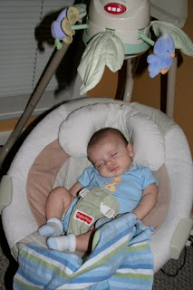 Elias enjoying the rainforest animals in his bouncer