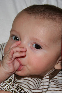This week Elias has finally gotten the hang of sucking his thumb. He has been trying to figure it out for about two months.