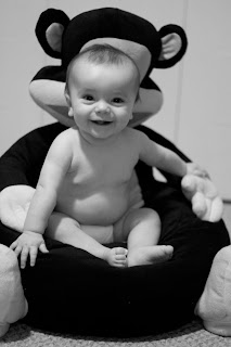 Here are Elias’s seven and eight month pictures on his monkey chair.