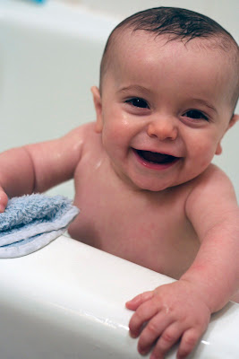 Take the bathtub for instance. He now can sit in it by himself, although he often prefers to go on his tummy and try to crawl around in it – or just flap his arms and legs really fast. It is adorable. We never put much water in the tub, so his bare butt hangs out of the water, making it even cuter. Yes, I have taken pictures, but I will refrain from sharing them. 🙂 I still haven’t lived down posting this ultrasound picture. Last night he was even trying to pull up on the side of the tub! I don’t think so little boy!