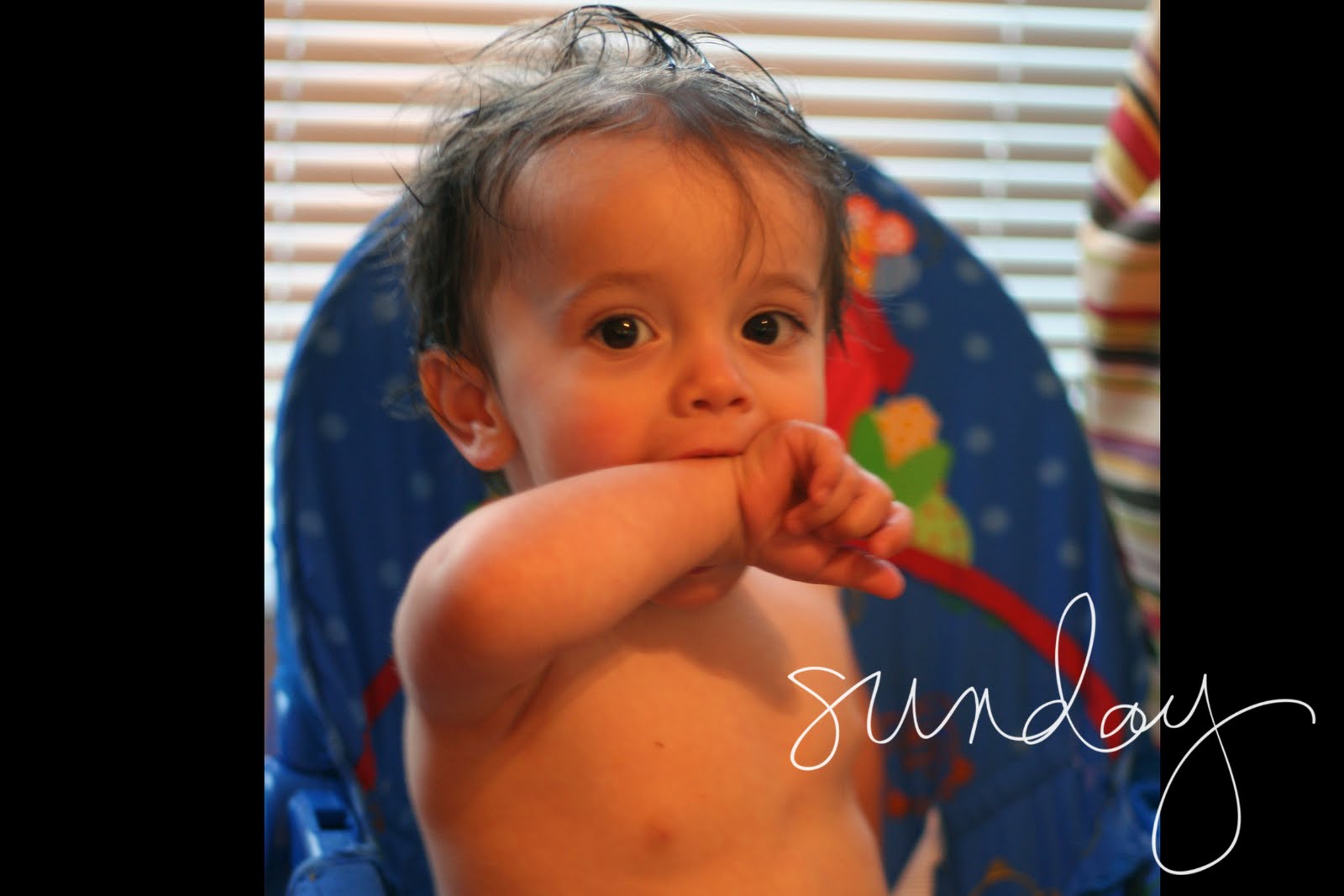 Sunday, April 18– Elias loves running around naked after his bath. He was so cute sitting in his chair, buck naked Sunday night.