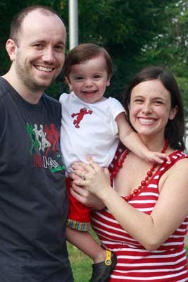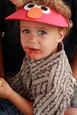 Elias’s Aunt Angie made him a special birthday outfit. She made the hat using a pattern from Frog Legs and Pony Tails and then made coordinating shorts. I ordered iron-on Elmo patches from ebay (from a vendor in Korea), and added them to the hat and the little white muscle tee.